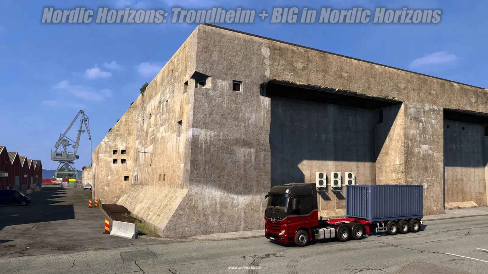 در قسمت شمالی تروندهایم، یک میدان دو طبقهی منحصر به فرد در امتداد Rv706 خواهید یافت که هم سطح زمین و هم یک سطح زیرزمینی را در بر میگیرد و به تونلی منتهی به مرکز شهر متصل میشود. در همان نزدیکی، ما یک مرکز خرید، تالار شهر و ایستگاه قطار لینگن را بازسازی کردهایم که همگی درست همانطور که در واقعیت هستند، در کنار هم قرار گرفتهاند. با ادامه دادن در امتداد Rv706، به منطقه بندری شهر خواهید رسید که محل قرارگیری یکی دیگر از بناهای تاریخی است: آغلهای زیردریایی دورا. درست در کنار آنها، مرکز دریایی تروندهایم و یک کارخانه محلی قرار دارد. از این منطقه، میتوانید سونای ساحلی محبوب و مکان فرهنگی محلی را نیز ببینید - همه چیز به طور دقیق برای انعکاس مکانهای واقعی بازسازی شده است.