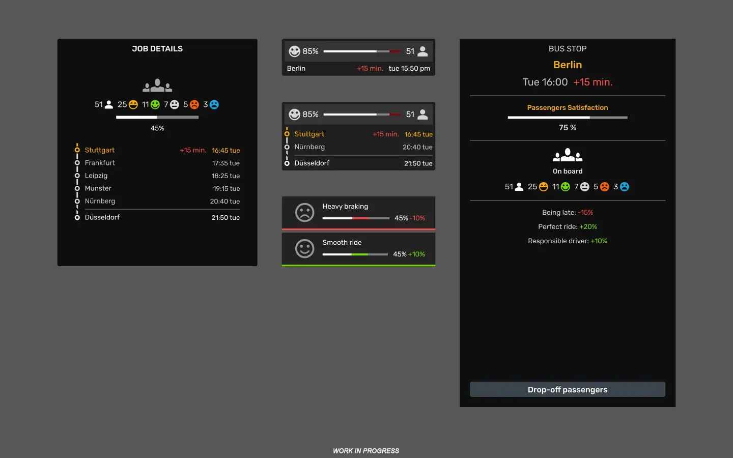ما رضایت هر مسافر را به صورت جداگانه محاسبه میکنیم، هر کدام با حساسیت خاص خودشان. برخی تقریباً اهمیتی نمیدهند که چه اتفاقی میافتد، در حالی که دیگران حتی ترمزهای ملایم را بسیار شخصی میگیرند. مسافران همچنین با حالات روحی مختلف سوار اتوبوس میشوند، بنابراین چالش برای بازیکن این است که تا ایستگاه بعدی حال آنها را بهتر کند. با ادامه سفر، بازیکنان به سمت هدفی واضح حرکت میکنند. هدف اصلی این است که با رانندگی نرم و روان، حال مسافران را تا حد امکان بهبود بخشند. اگر رانندگی بین ایستگاهها بینقص باشد، بازیکن جایزهای دریافت میکند که به رضایت کلی مسافران افزوده میشود.